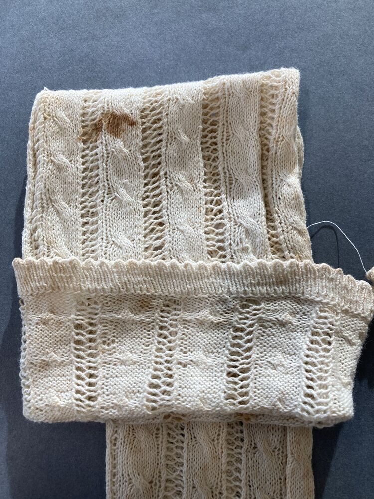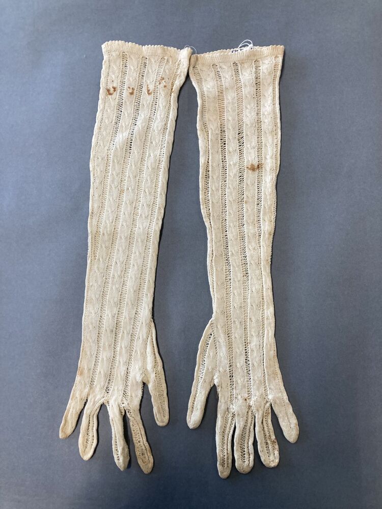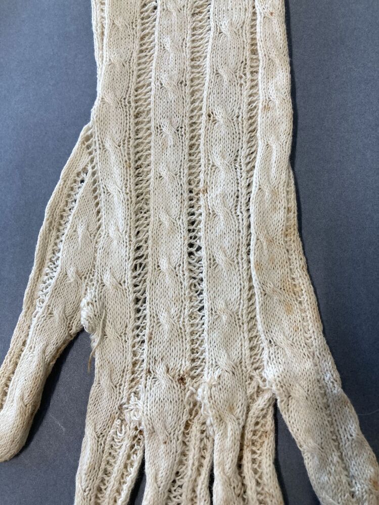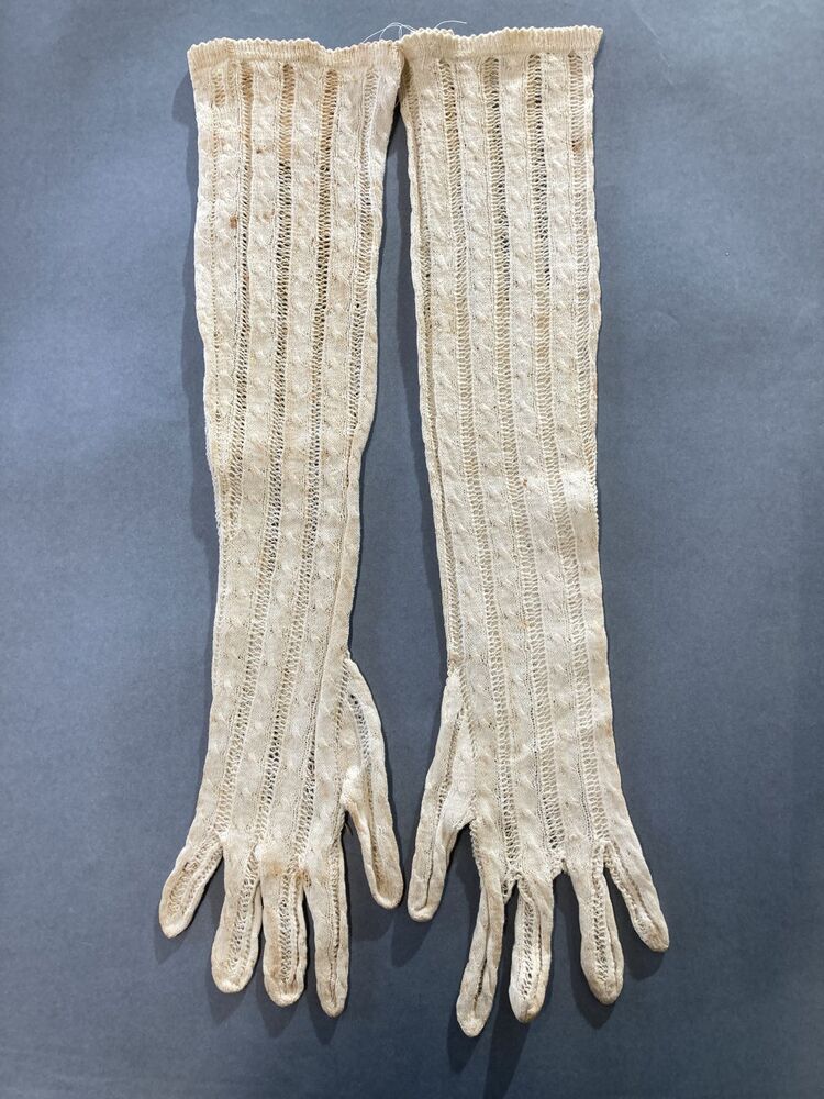 Paar lange gebreide empire handschoenen met kabels en ajour randen