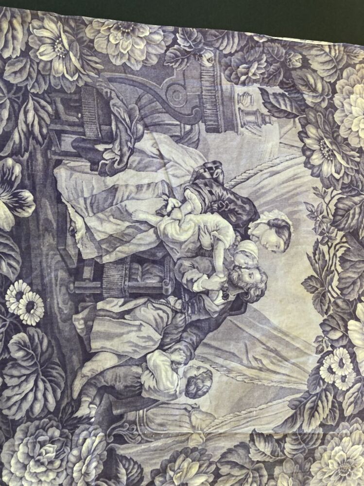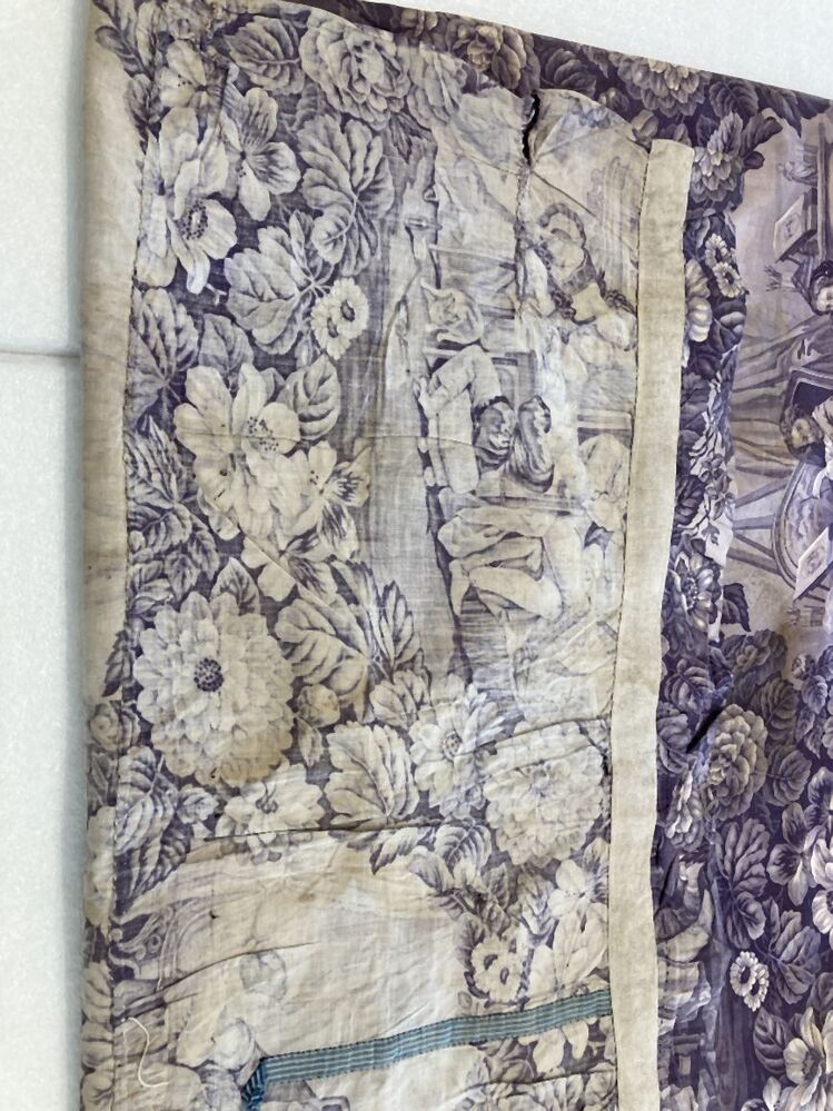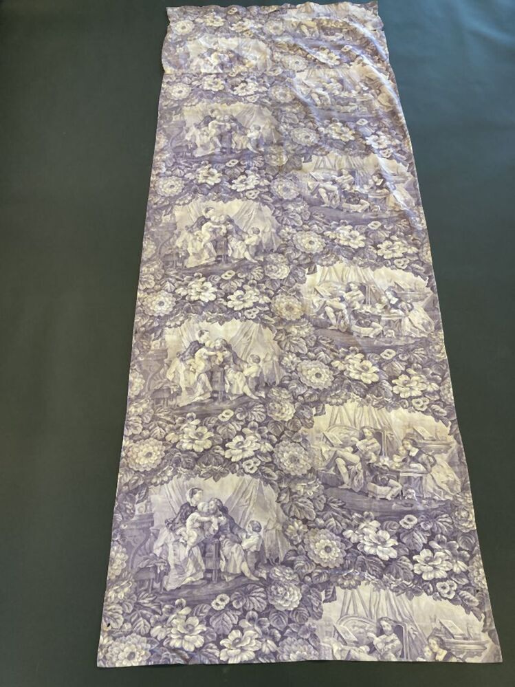 Paars overgordijn van bedrukt katoen met ovaalvormige huiselijke voorstellingen, omringd door bloemen