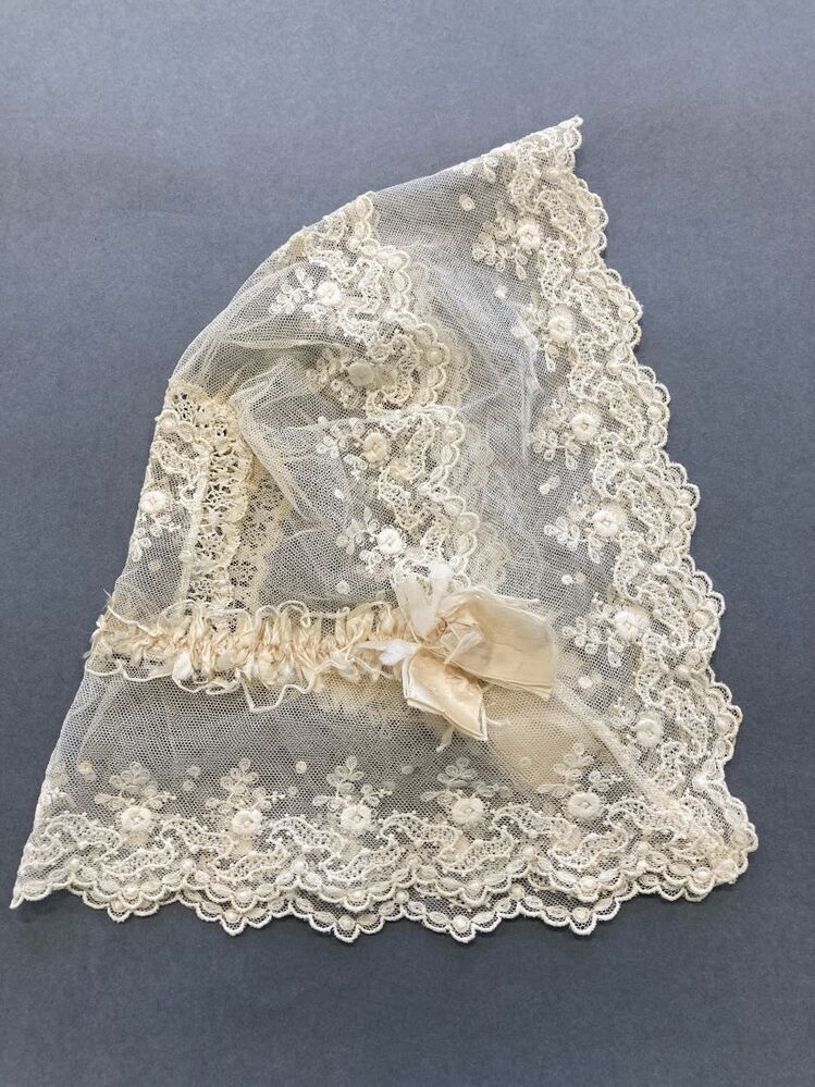 Huismutsje voor oudere dame, van machinaal geborduurde tule met geplooid zijden lint en strikken en kloskant tussenzetsel