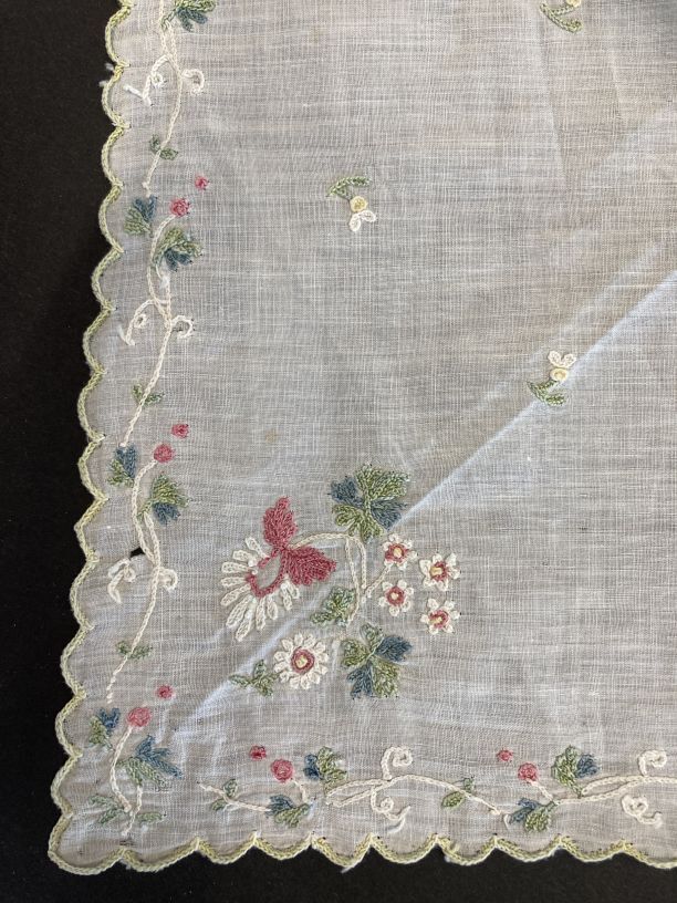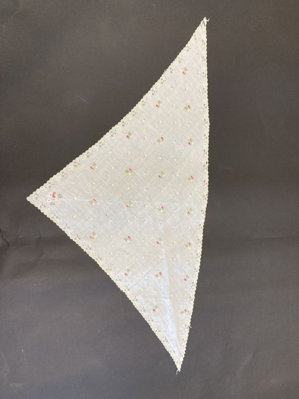 Batisten tipdoek met verbleekt gekleurd tamboereerwerk en geschulpte zomen
