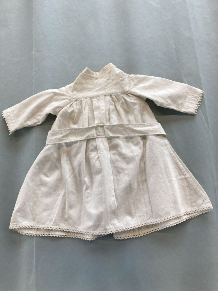 Babyjurk of nachthemd van wit katoen met ingeweven bloemetjes in de rok en damastpatroon in pas en mouwen, met ceintuur
