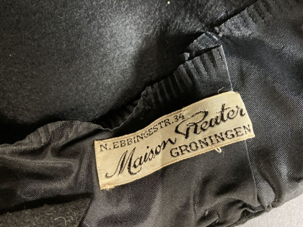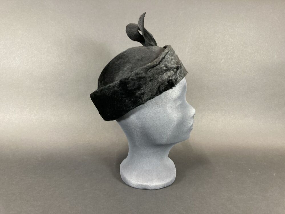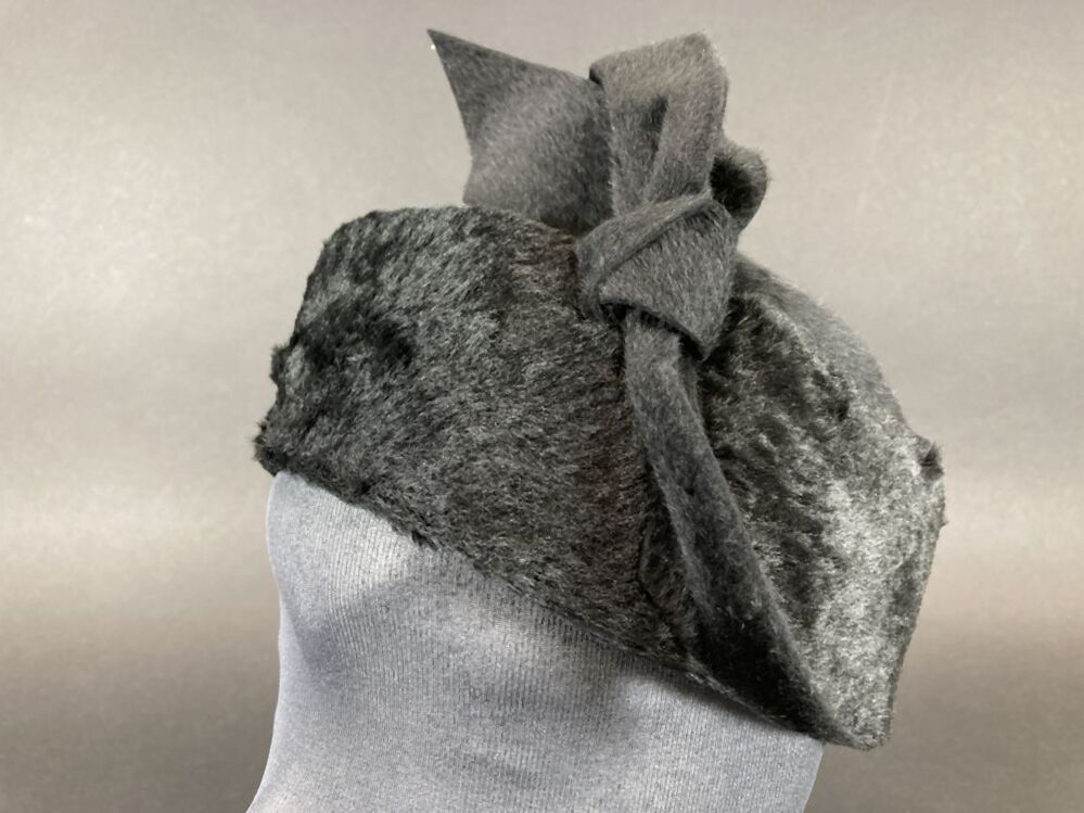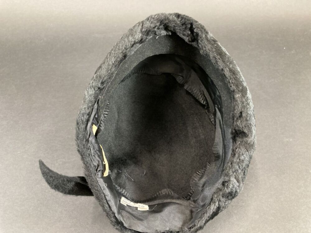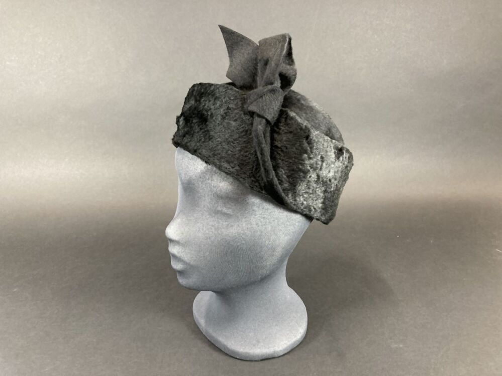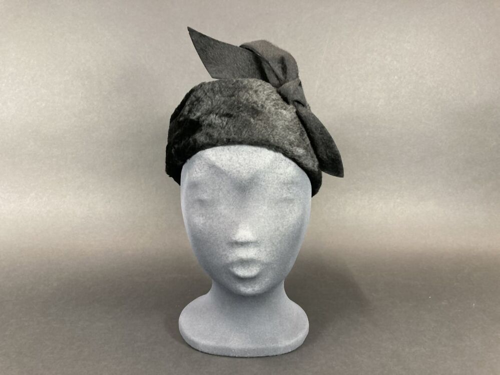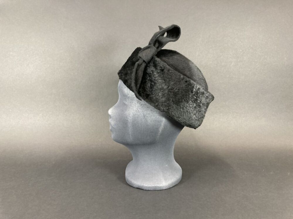 Dophoedje van zwart haarvilt met imitatiebontrand met asymmetrische strik rechtsachter