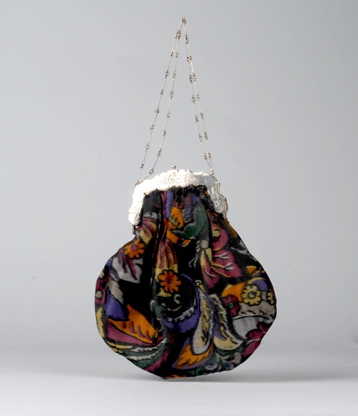 Beugelbeurs met zilveren beugel waaraan ketting en veelkleurige beurs