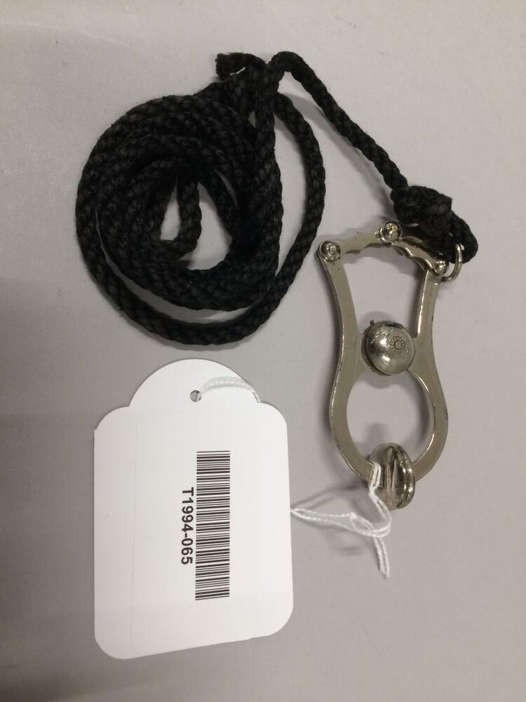Rokophouder, metalen klem met ronde grijpertjes en zwart koord met lusje op het eind