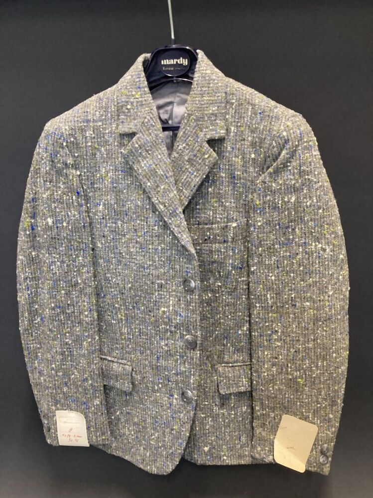 Tweed jongenscolbert, grijs gemêleerde wol met blauwe, witte en groene stipjes in de wol, twee sierknoopjes op de mouw