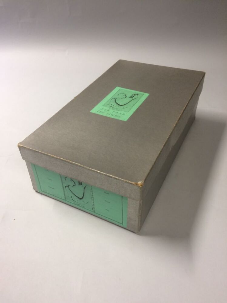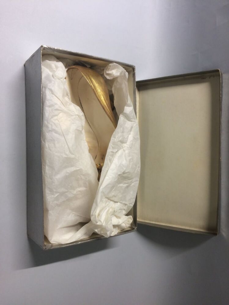 Zilverkleurige doos met groen etiket: Luxy: "Elk paar een juweel" horend bij een paar goudkleurige damespumps