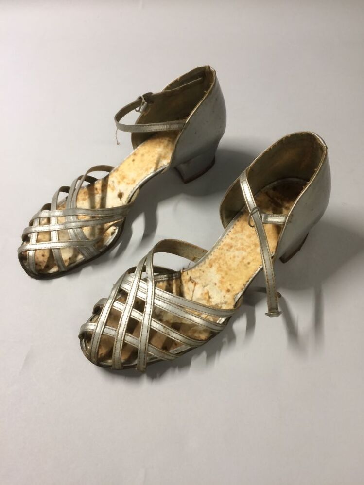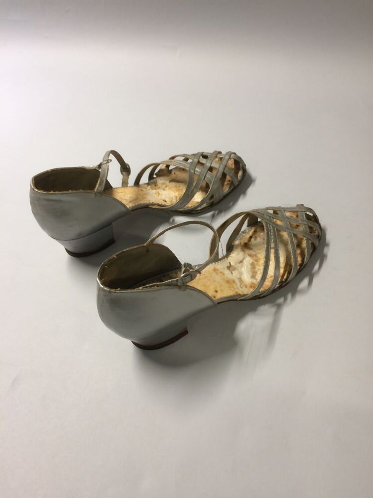 Paar zilverkleurige avondschoenen met halfhoge blokhak, gesloten hiel en voorvoet van smalle kruisende bandjes, wreefband met gespje