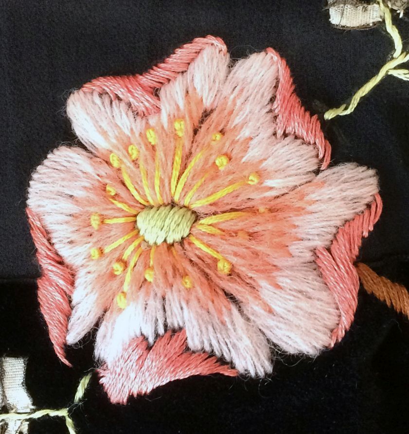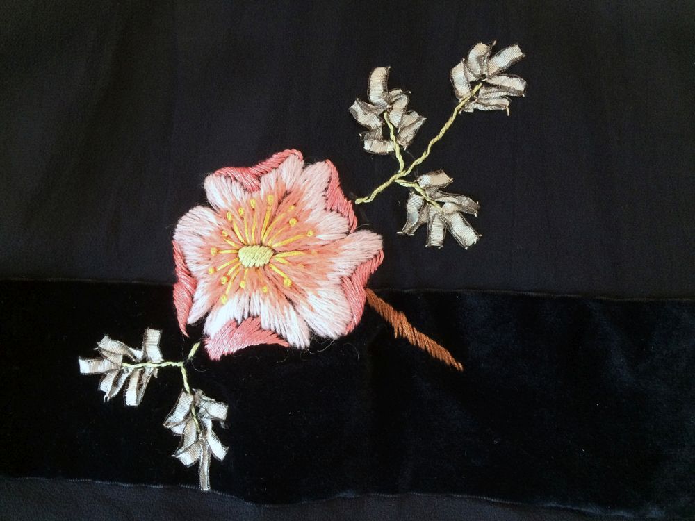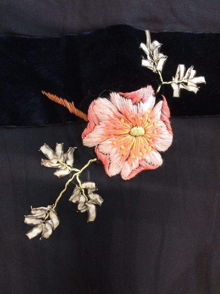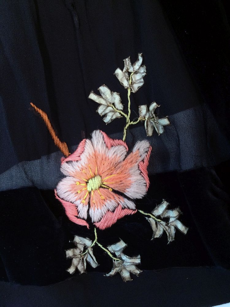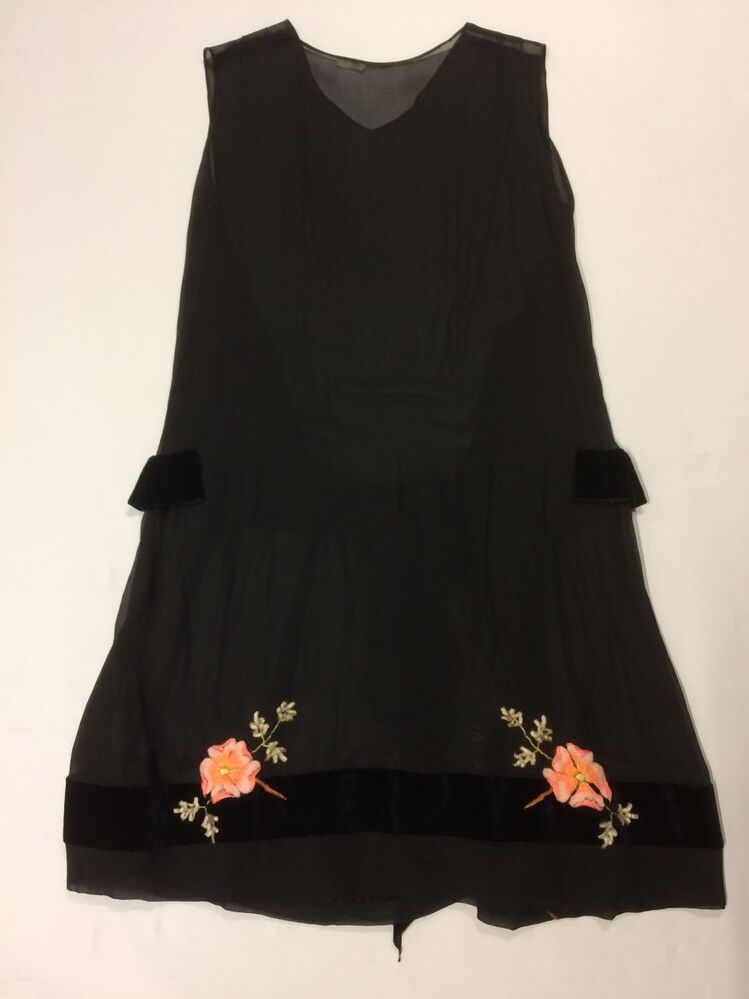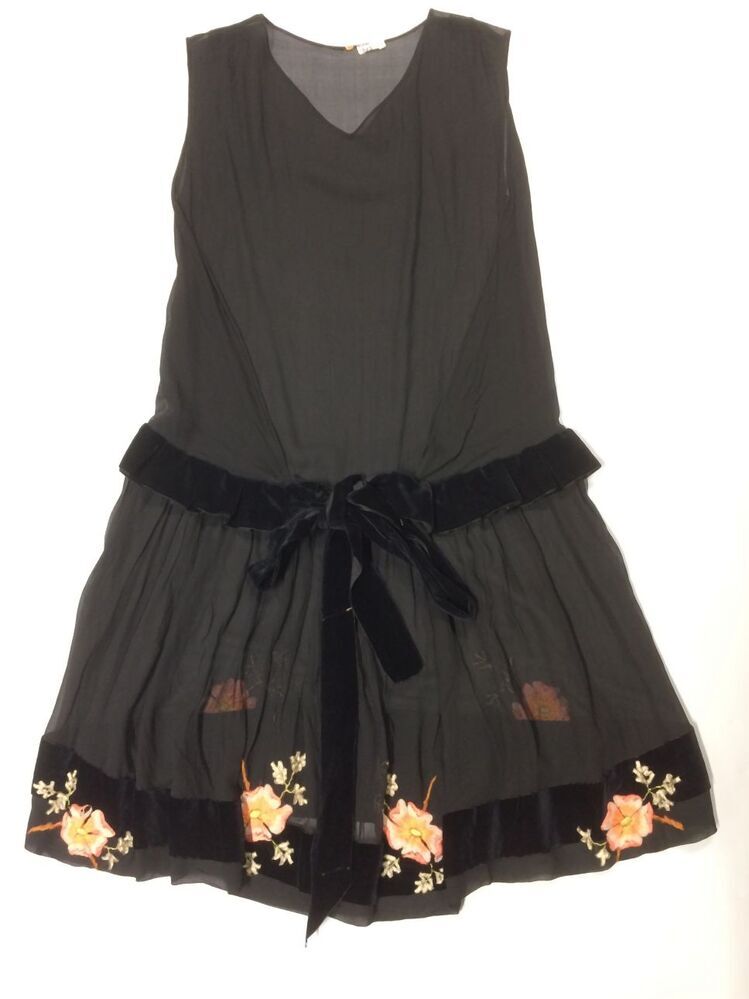 Zwart zijden crepe-georgette mouwloze jurk met verlaagde taille, afgezet met fluweelband en floraal wol- en lintborduursel, charlestonjurk