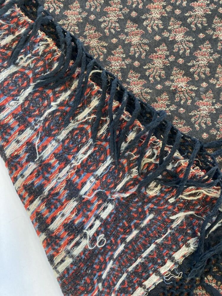 Omslagdoek van zwarte wol met ingeweven rand en strooimotiefjes, kasjmierstijl