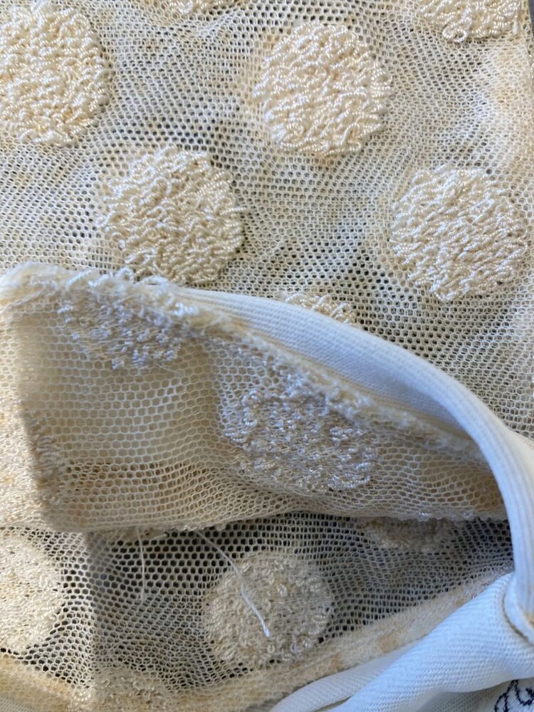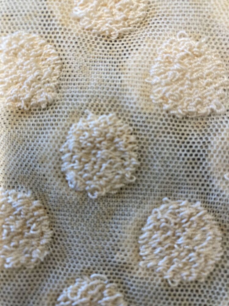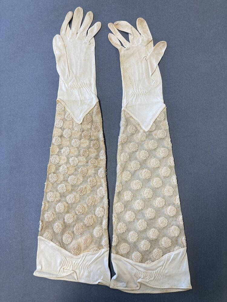 Paar nylon-tricot lange handschoenen met tule mouwdeel met reliëfnoppen, cremekleur