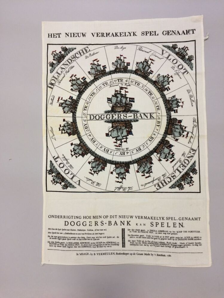 Reclame-droogdoek bedrukt met een Doggersbankspel uit 1782