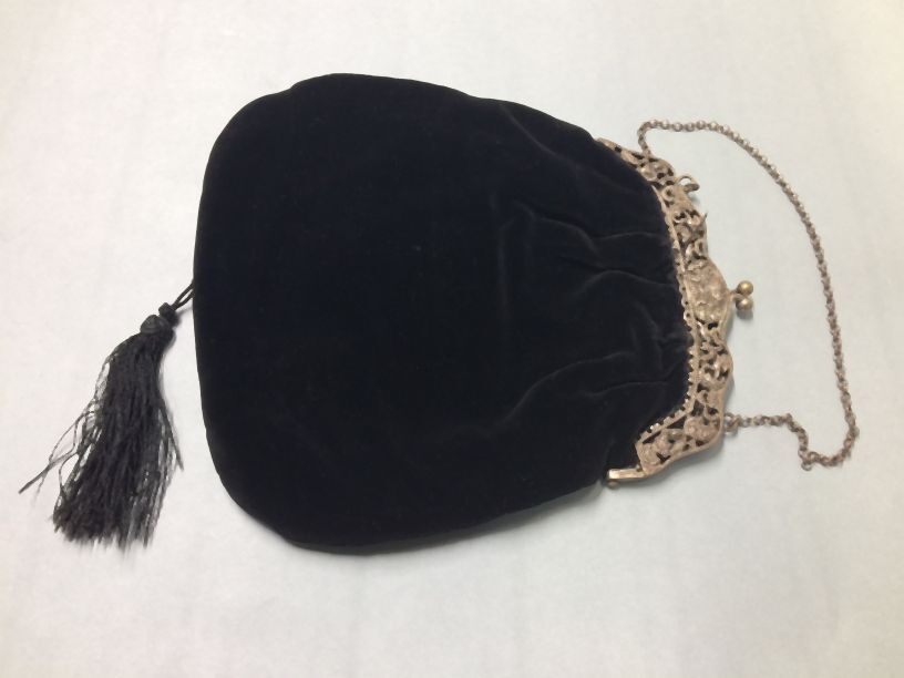 Beugeltas met kwast en zilveren beugel aan ketting en zwart fluwelen tas