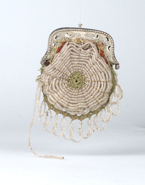 Beugelbeurs met zilveren beugel waaraan beurs van kralen