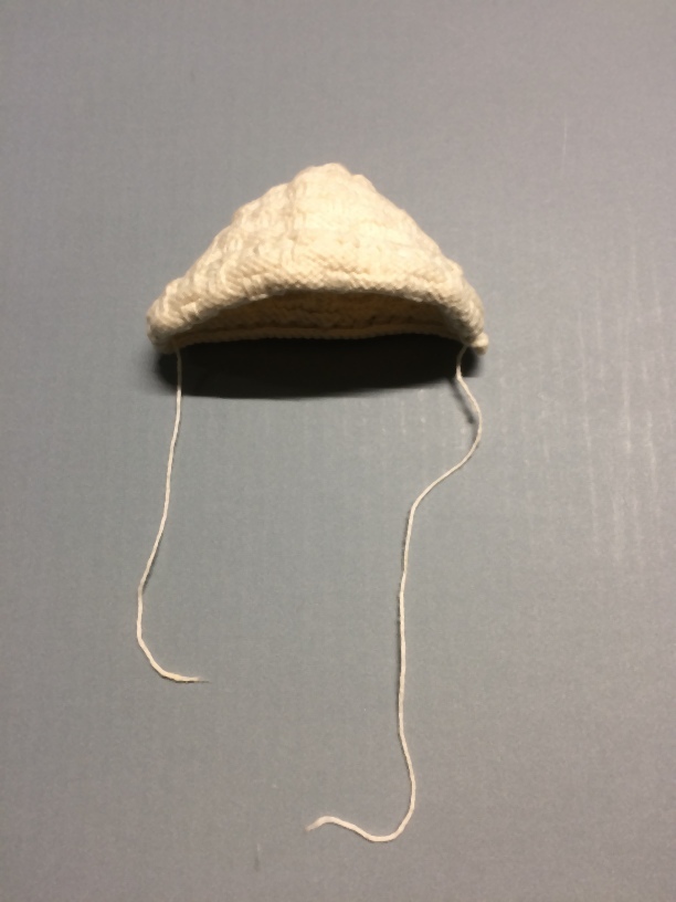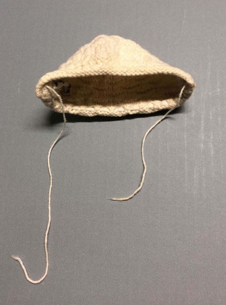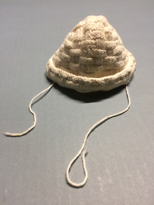 Gebreide poppenmuts in vlechtpatroon van wit katoen met lichtblauw lintje