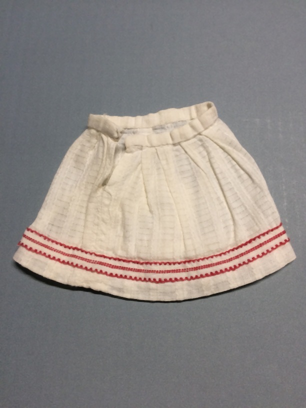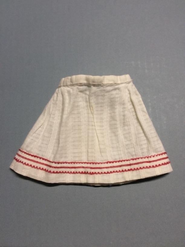 Poppenrokje van witte ajourstof met rood-wit randje, onderdeel van groep van twee