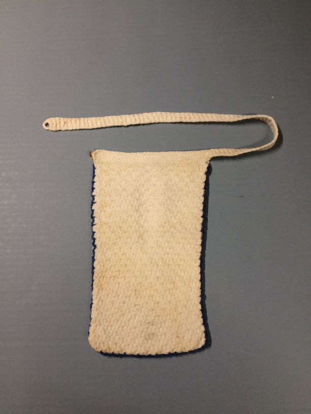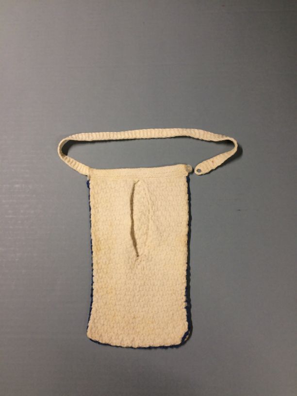 Meisjesvoorspanzak gebreid in blokjes van wit katoen, omhaakt met blauw randje, met gebreide tailleband en parelknoopje