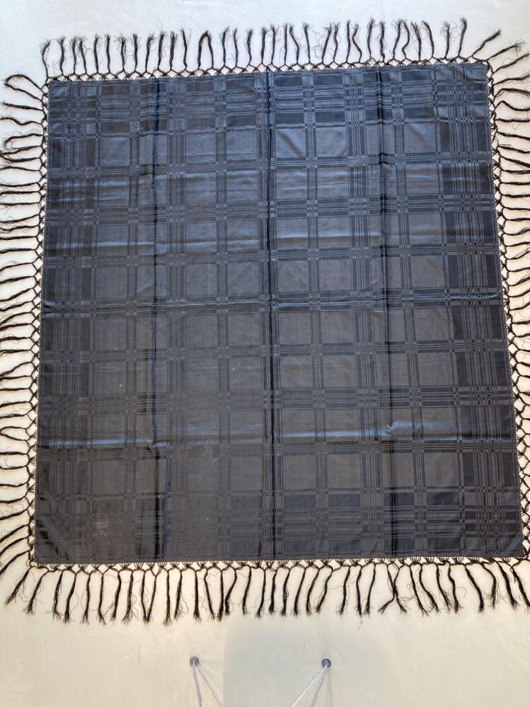 Omslagdoek van zwarte zijde met ingeweven ruitpatroon en geknoopte franje