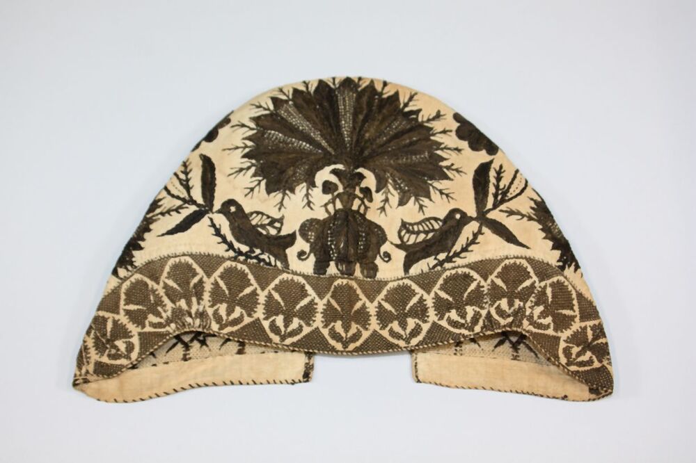 Vrouwenmuts van linnen met zwart zijden bloempot en vogelmotieven geborduurd