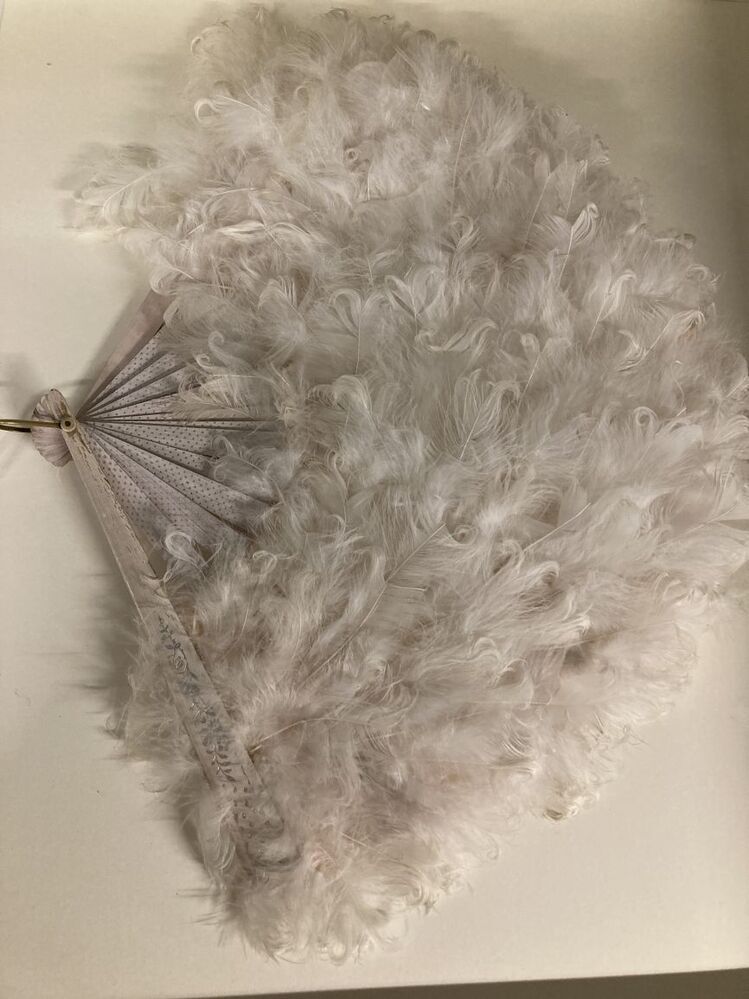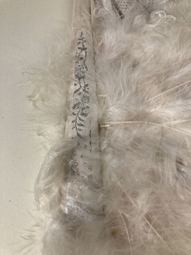 Vouwwaaier met bleekroze bamboe benen waarop zilver decoratie en waaierblad met witte veertjes