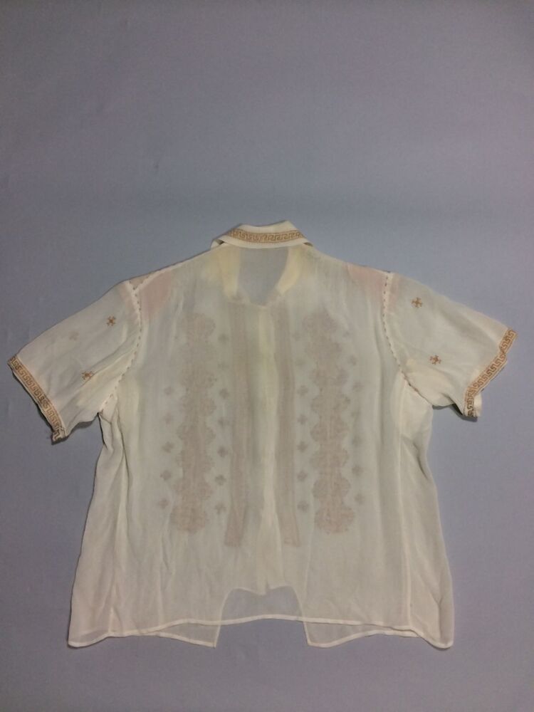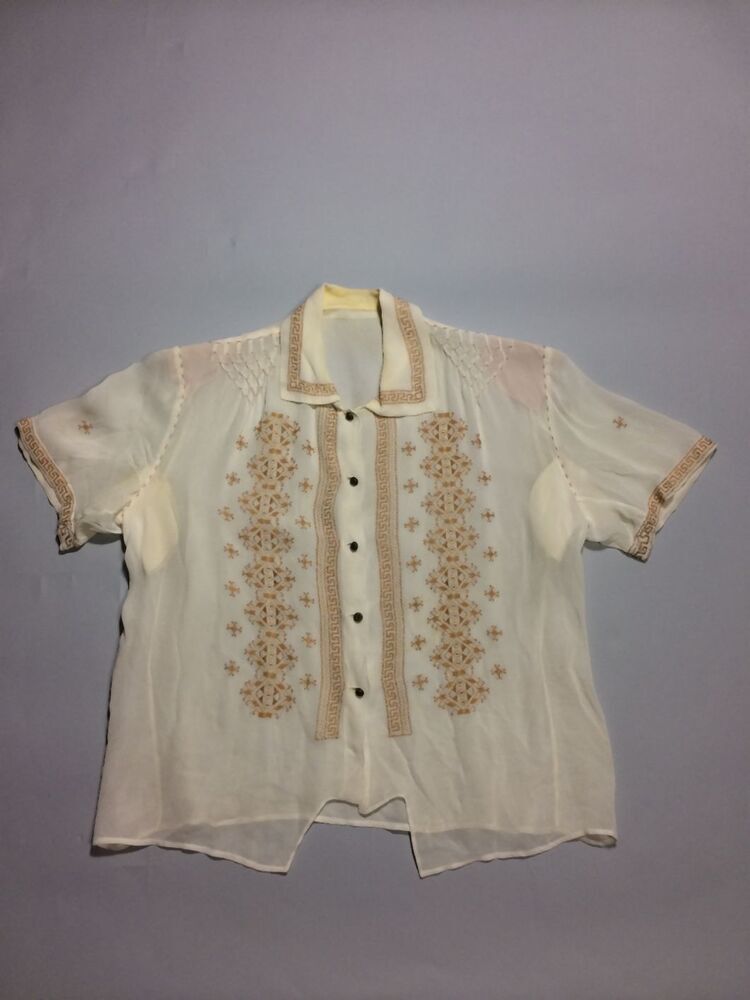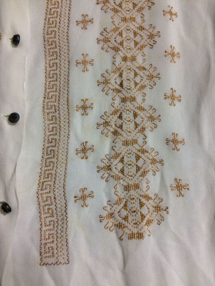 Witte blouse van dunne wollen crèpe met folkloristisch kruissteek borduursel in lichtbruin, met zilveren knopen