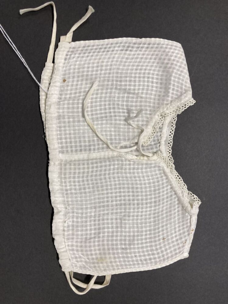 Kinderkroplapje of onderst van witte batist met ingeweven ruitje, broderie langs hals