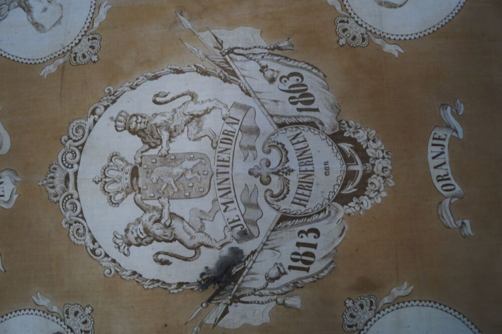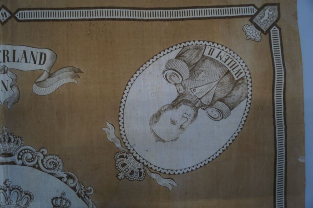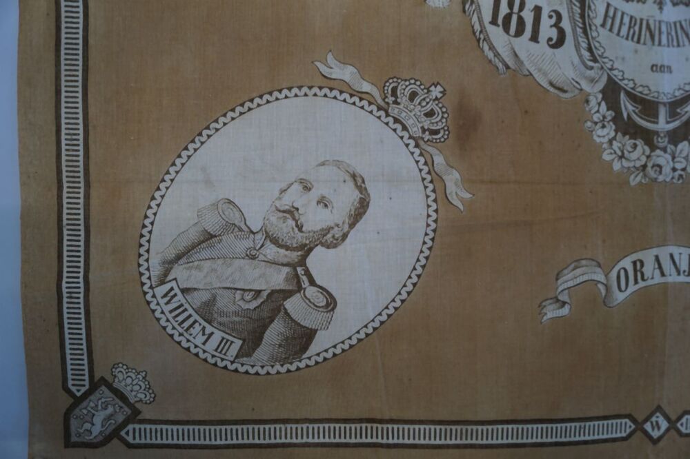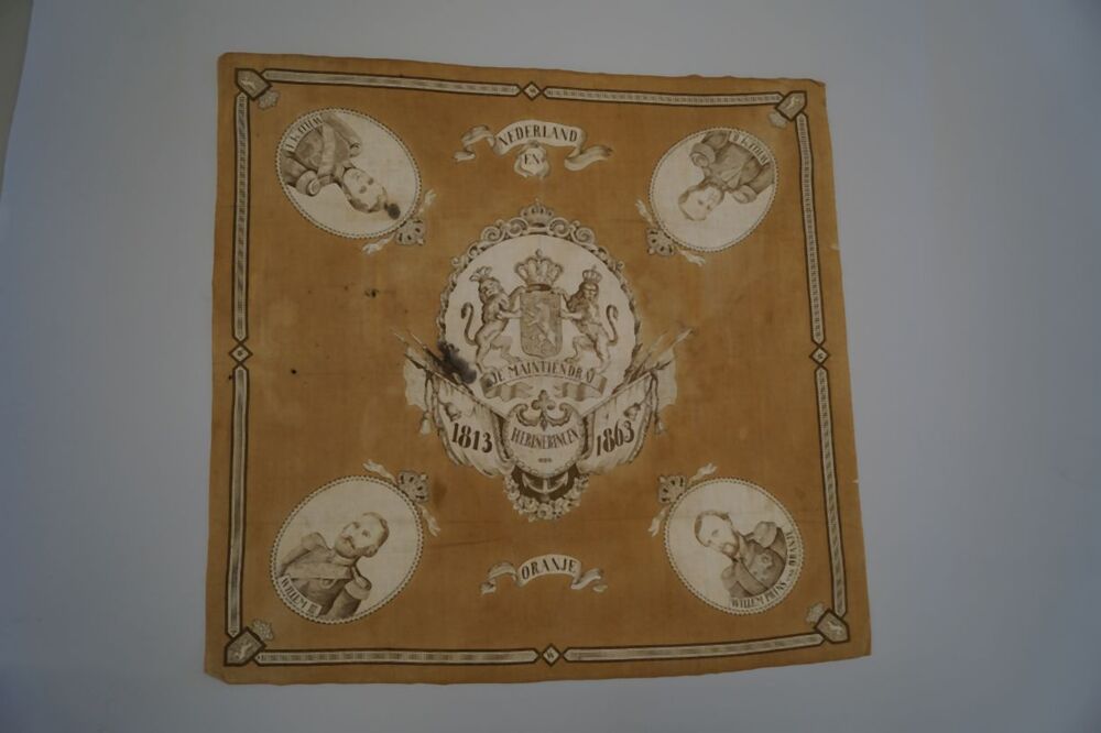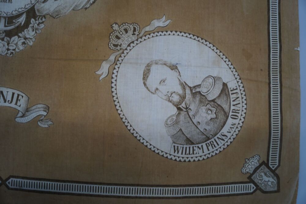Oranje gedenkdoek ter herinnering aan Nederland en Oranje, 50 jaar koningshuis met portretten van Willem I, II, III en Willem van Oranje
