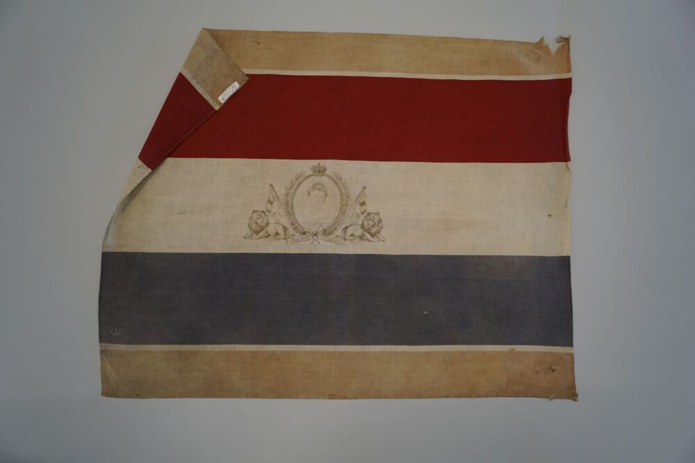 Oranje-rood-wit blauwe vlag met portretje van Koningin Wilhelmina ter herinnering aan de troonsbestijging