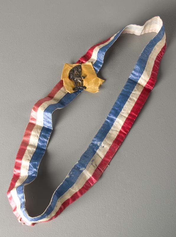 Rood-wit-blauwe zijden sjerp met oranje strik met zilveren figuurtje van een Kozak