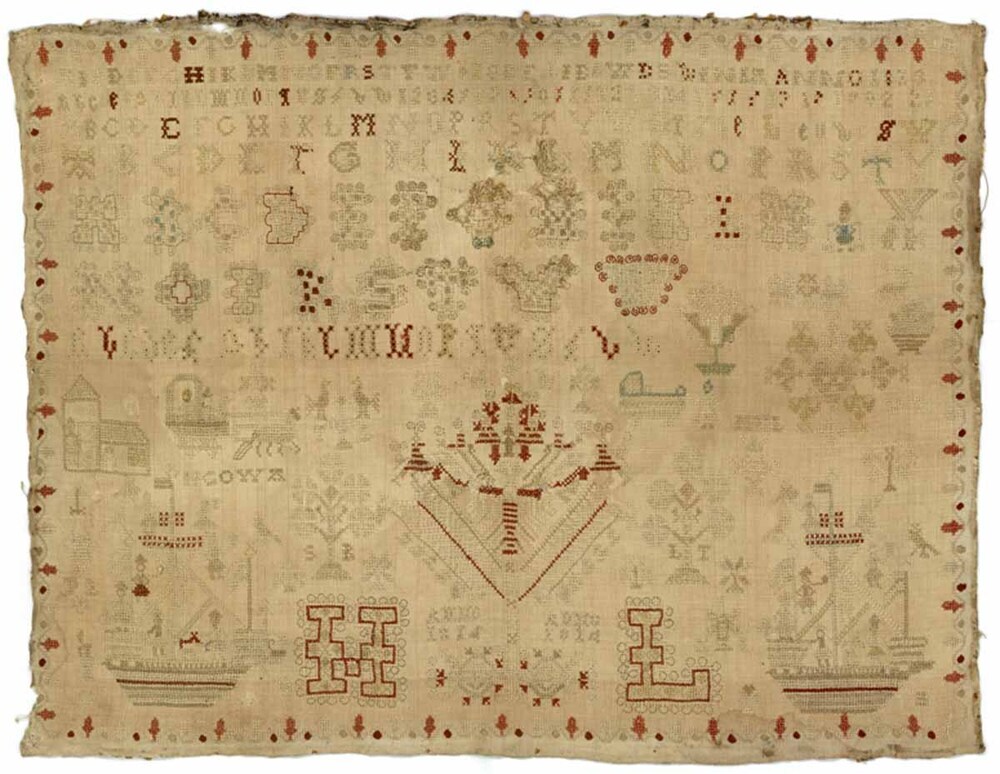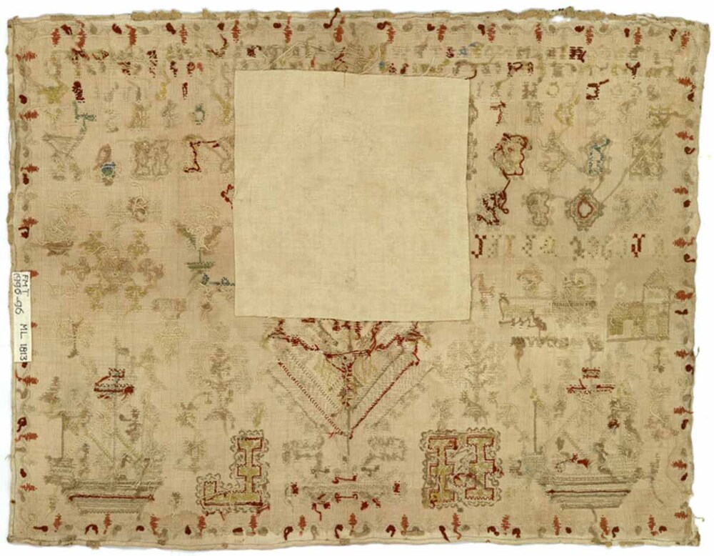 Merkletterlap, geborduurd met beige en rood, gemerkt Hiske Lieuwes Winia 1813-1814