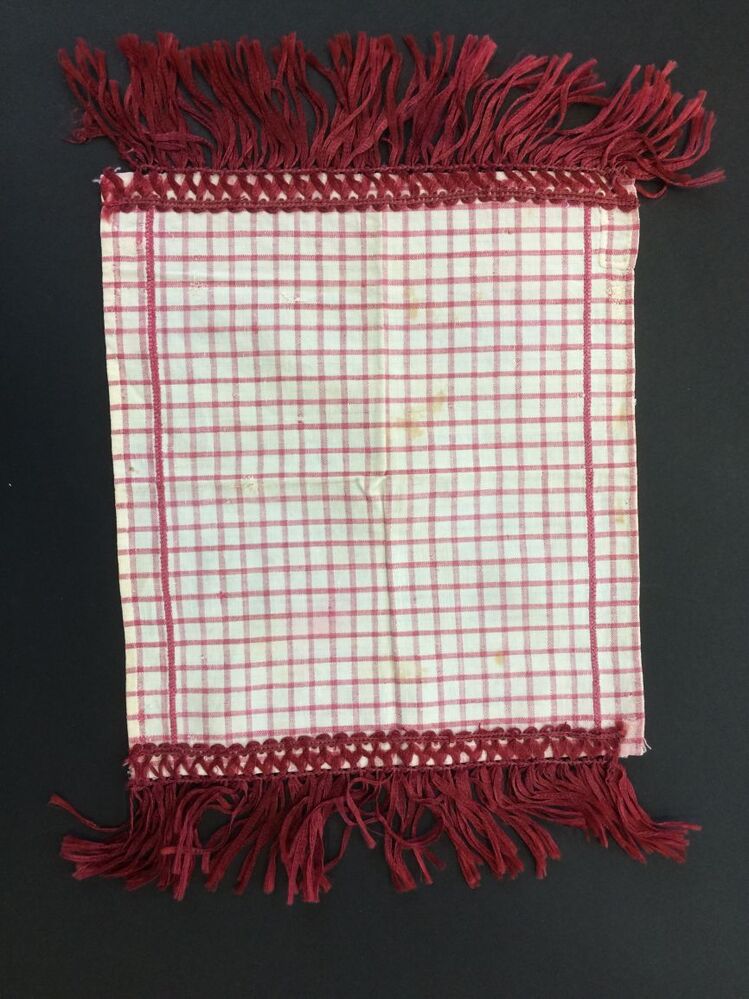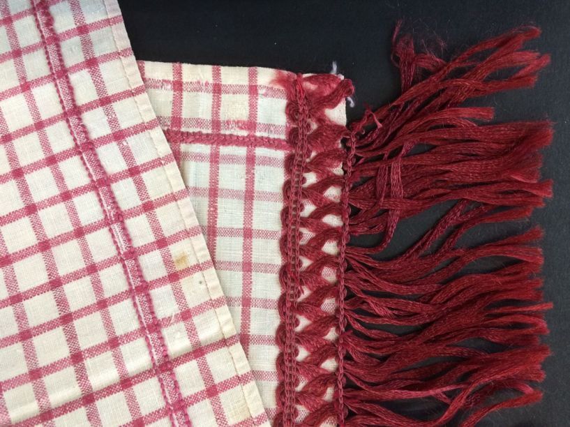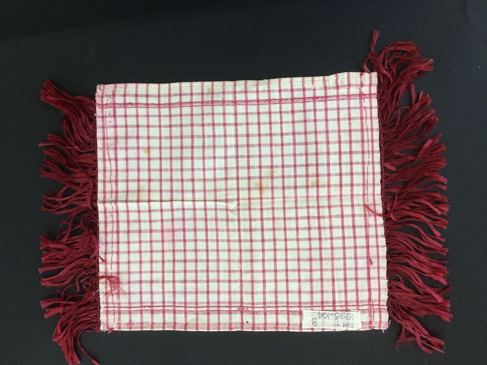 Foarpeldook in wit en rood met rood borduursel boven en onder, enkele ruit, links en rechts rood zijden franje, uit de omgeving Hindeloopen