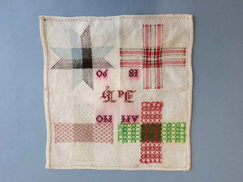 Kleine stoplap met vier stoppen, gemerkt JdH anno 1890, zijde op katoenen stramien