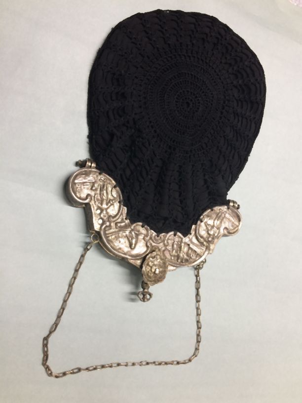 Zilveren tasbeugel met gedreven voorstelling aan ketting en ingestippeld KI 1793
