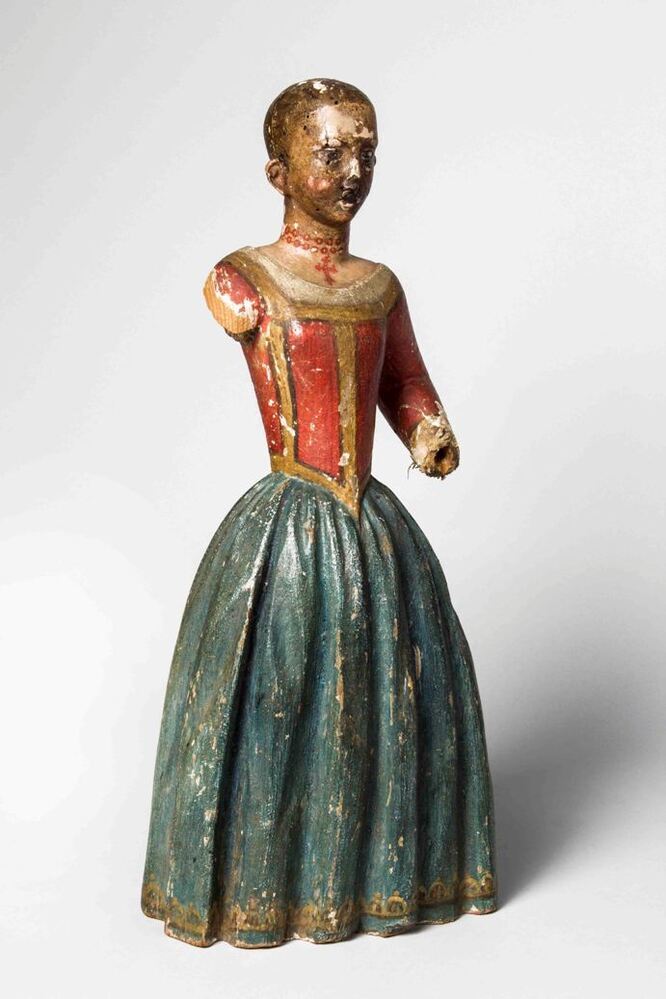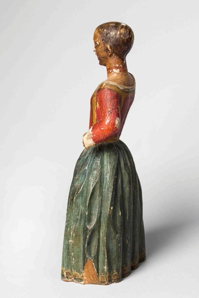 Gesneden houten pop uit een stuk, beschilderd met kleding uit ca 1580