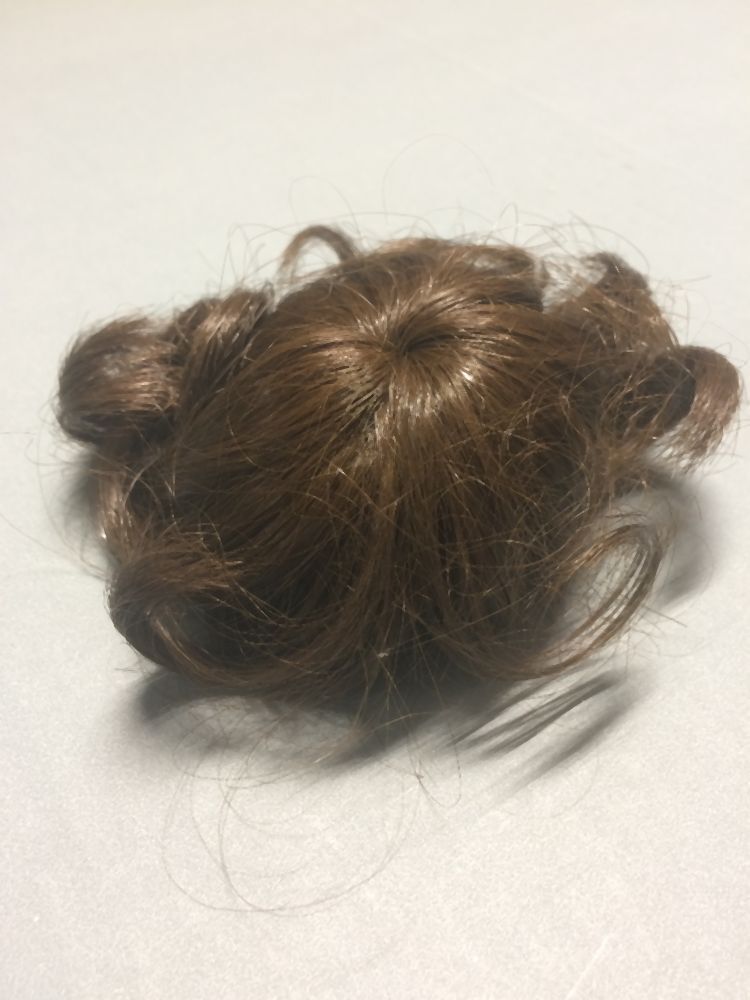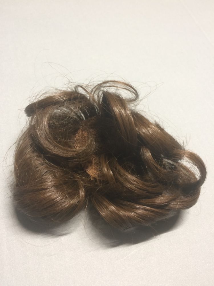Pruik van donkerblond echt haar met grove krullen, onderdeel van gesneden houten pop