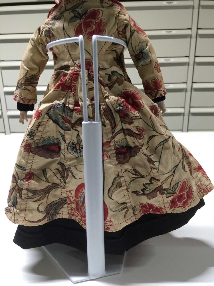 Wentke, openvallende jas van sits, exotische bloemen op witte grond, afgezet met rood-wit langetband, onderdeel kostuum van pop in Hindelooper dracht