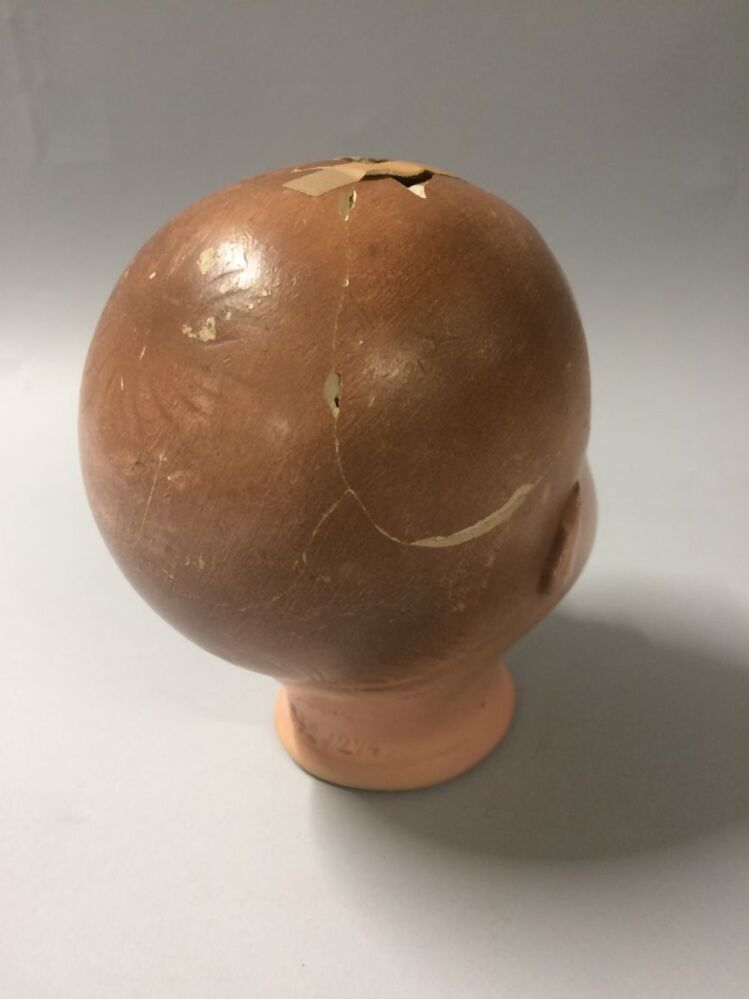 Baby poppenkop, jongenskopje met kort haar, gebarsten schedel, ogen missen, gemerkt A.M. 542/2 1/4