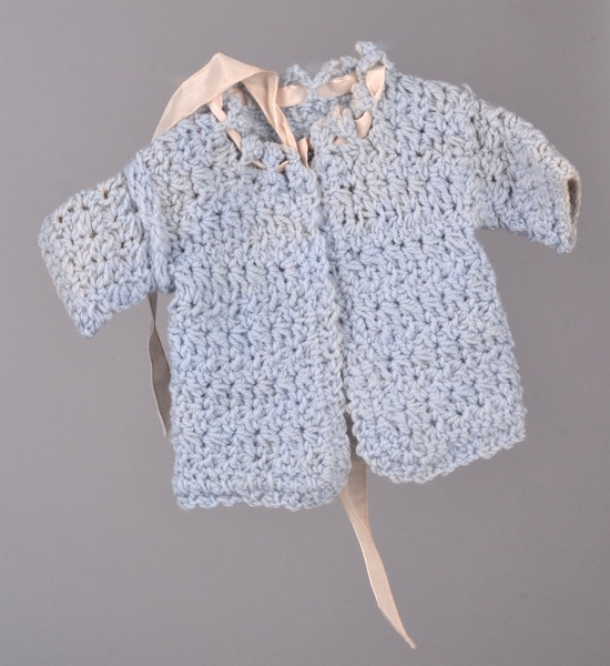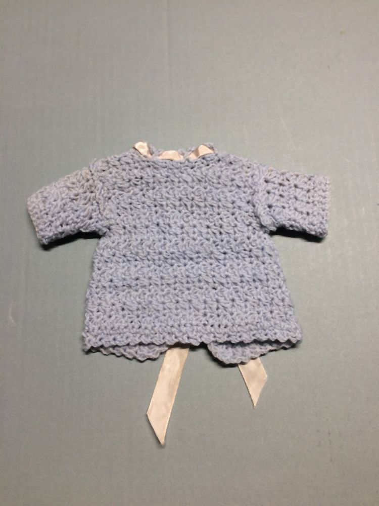 Poppentrui gehaakt van lichtblauwe wol met een kunstzijden strik bij de hals, onderdeel van kleding karakterpop