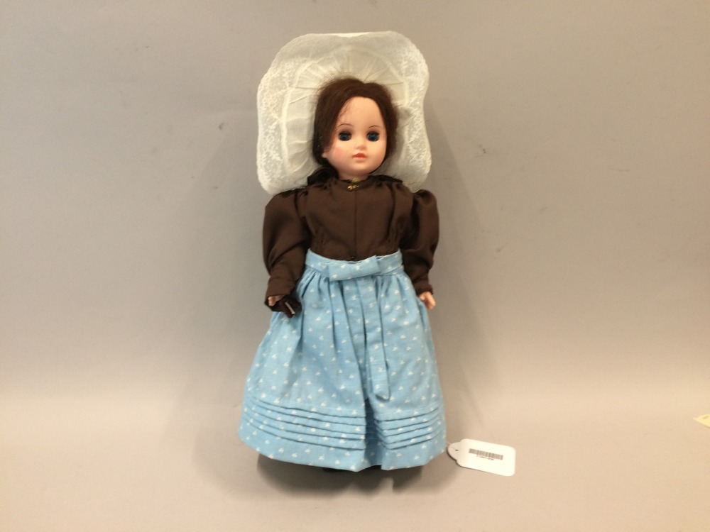 Klederdrachtpop van vinyl in bruin Huizer vrouwenkostuum met kanten 'Isabee'