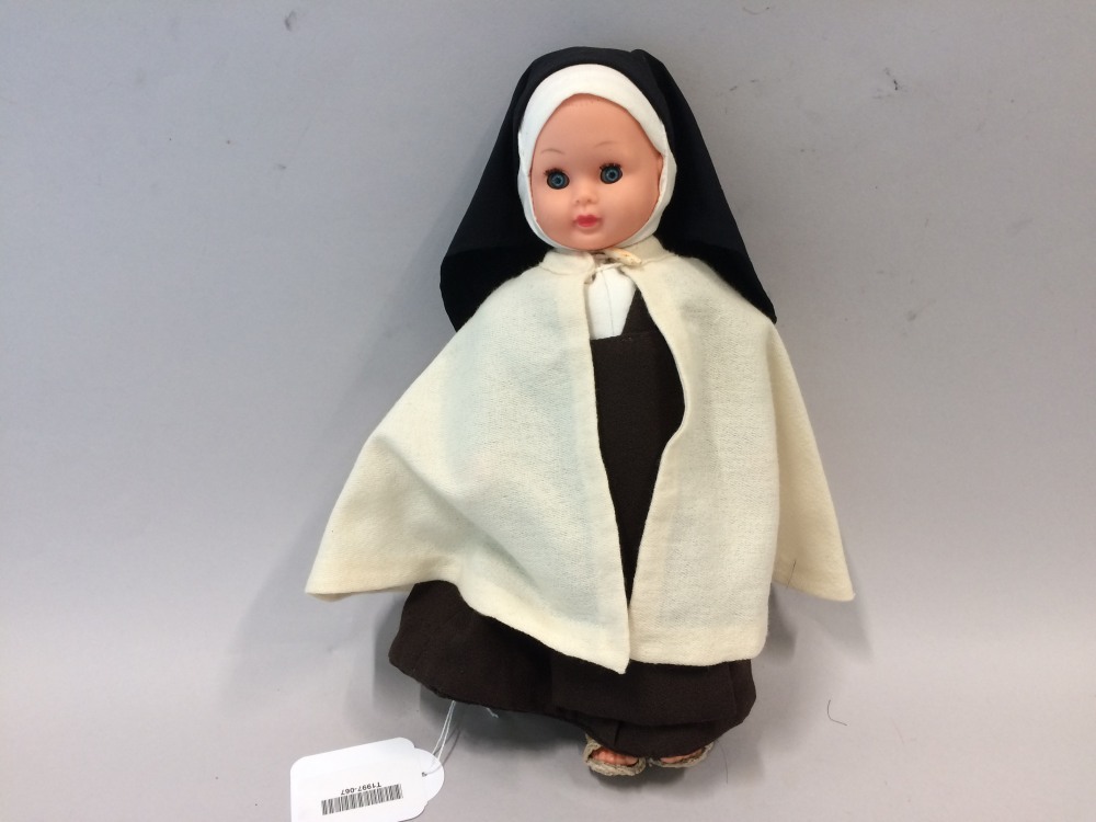 Klederdrachtpop van vinyl, gekleed als non in bruin habijt met witte mantel