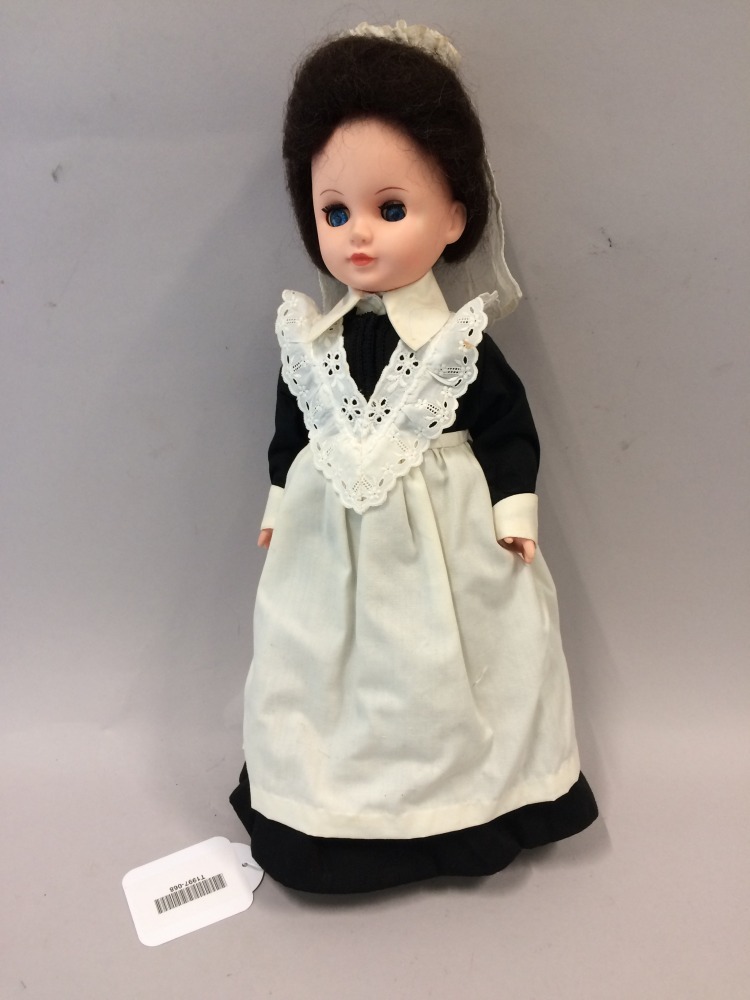 Klederdrachtpop van vinyl, gekleed als dienstbode in zwarte jurk, wit schort en kapje