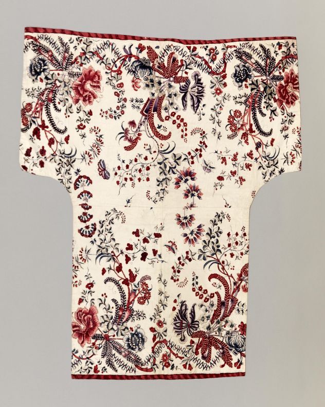 Wikkelkleed van sits, witte grond, gemaakt van rokrand, gespiegeld aan elkaar gezet, gevoerd met wit linnen
