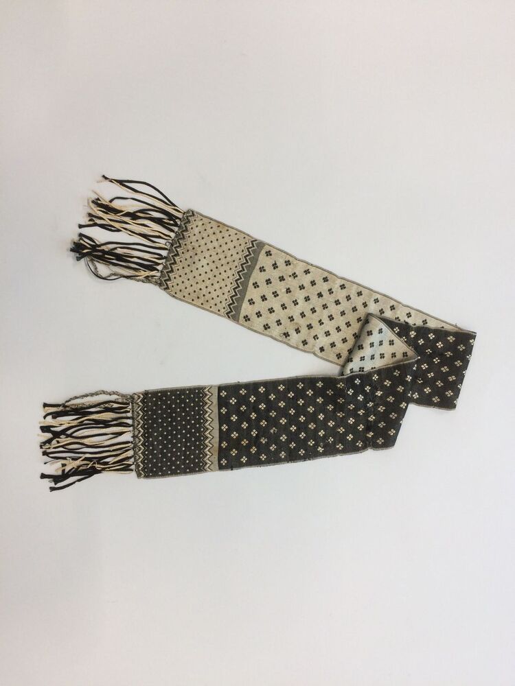 Smal zijden jaquard sjaaltje met klaver-vier, stip- en zigzagmotief en franje in zwart-crème