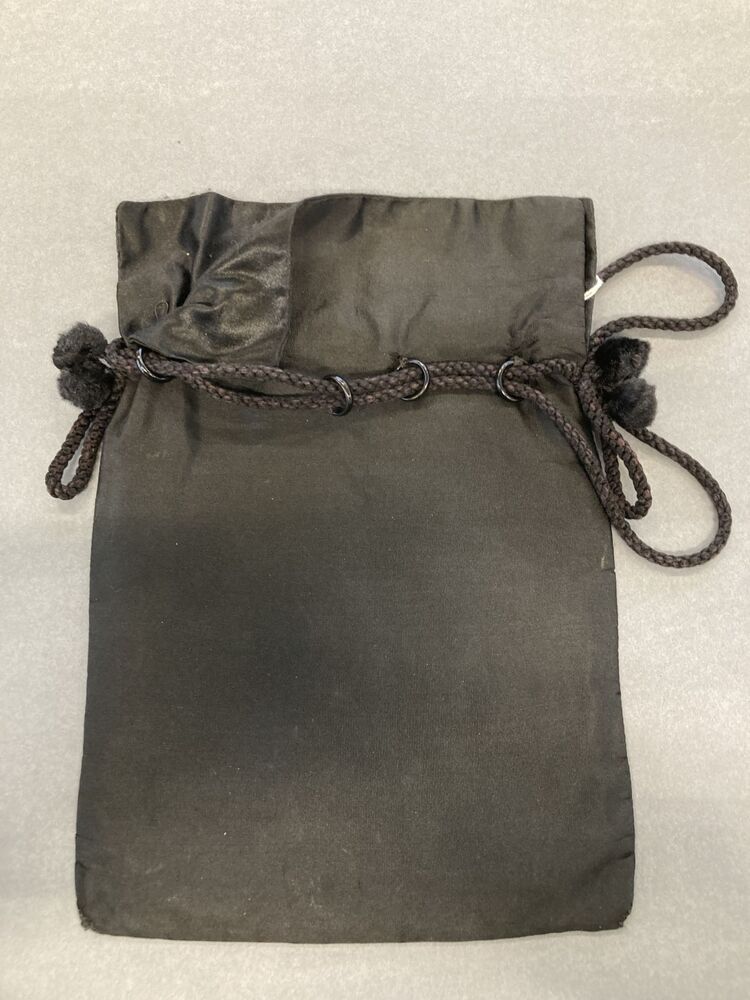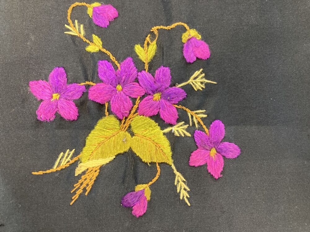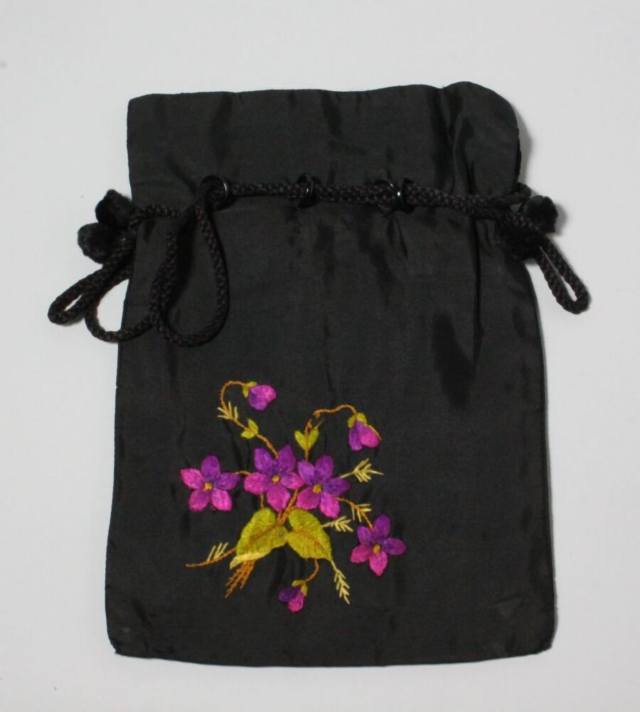 Zwart zijden reticule of tasje geborduurd met zijden viooltjesmotief