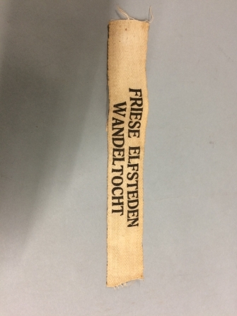 Bandje met de tekst: FRIESE ELFSTEDEN WANDELTOCHT, cremekleurig spitskeperband, kapitale schreefletters, onderdeel van groep van vier