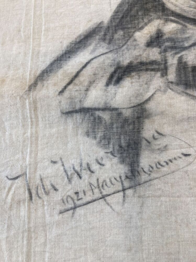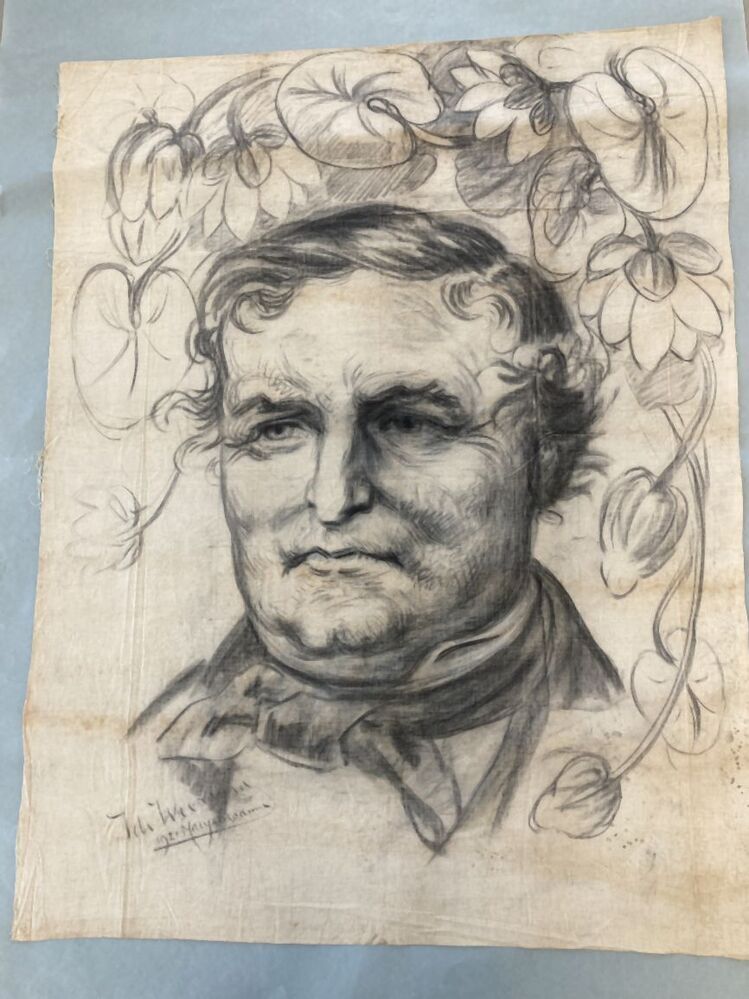 Gedenkdoek met daarop portret van Eeltsje Halbertsma, omgeven door waterlelies met houtskool op wit katoen