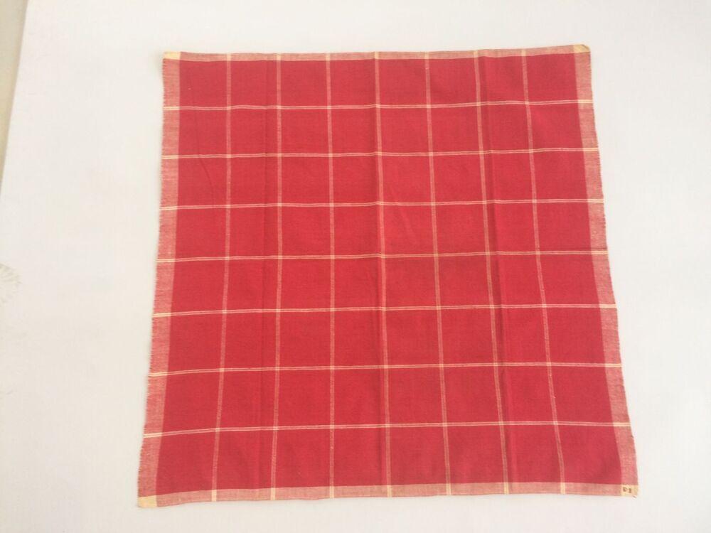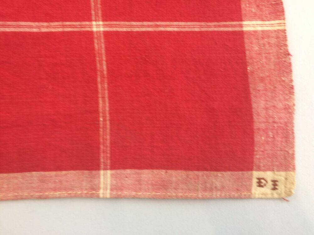 Vierkante halsdoek van roodgeruit katoen, gemerkt DI