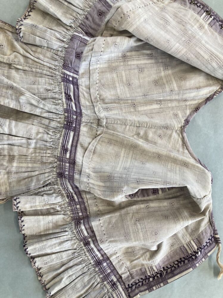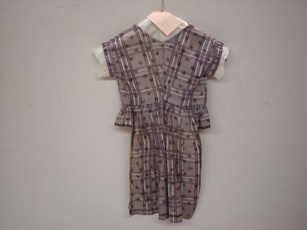 Schort met aangesloten lijfje, schootje achter gemaakt van een met paars bedrukte doek met ruiten