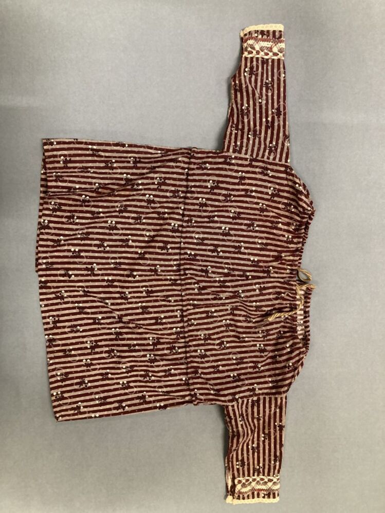 Japonnetje van donkerrood gestreept bedrukt katoen met gekleurd machinaal kloskant