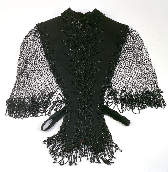 Fichu-pelerine van zwarte ribszijde met kraaltjes en kralen-net schouderbedekking