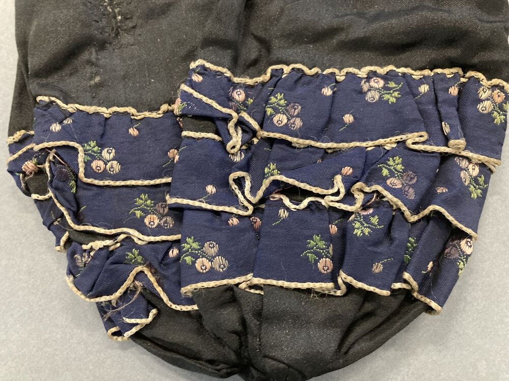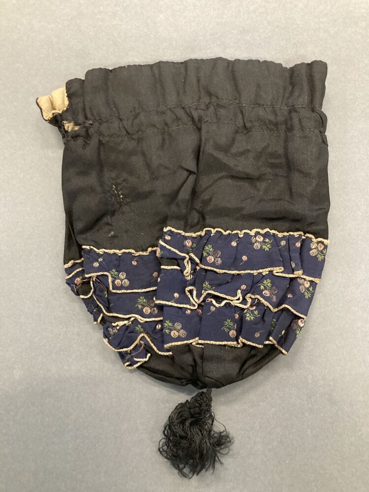 Zwart zijden reticule met drie opgenaaide stroken blauw sierband met ingeweven besjes